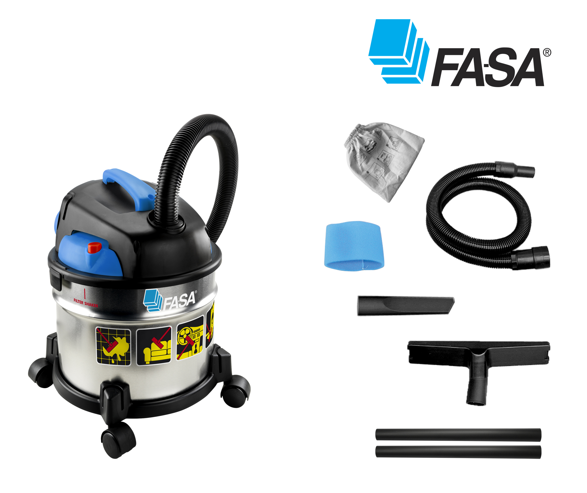 Dielenský vysávač WS 20 FASA, Inox - pre suché a mokré vysávanie, motor max. 1200 W, odpadová nádoba 20 lt, vrátane príslušenstva. Ideálna veľkosť vysávače pre vysávanie interiérov áut a pod. Made in Italy