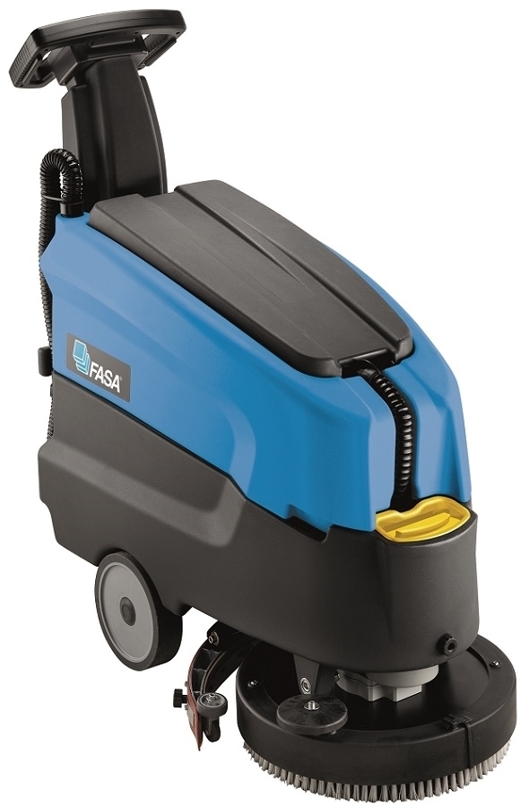 Čistiací stroj na podlahu A4 45 E Fasa. Napájanie 230 V, umývacia šírka 450 mm, dĺžka sušiace lišty 540 mm, otáčanie na malom priestore, systém rýchlej výmeny kotúča