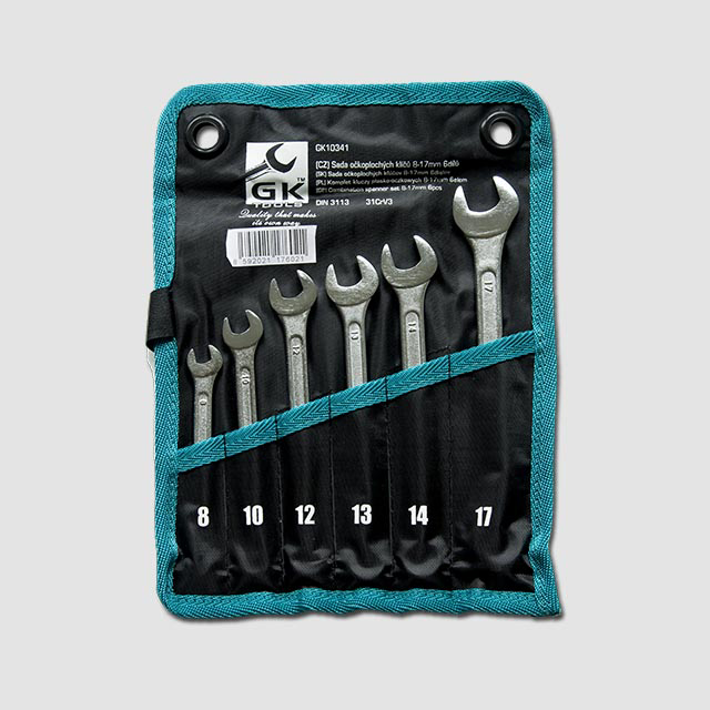 Sada očkoplochých klíčů je uložena v plastovém držáku. Klíče jsou z jedné strany ploché otevřené, ze strany druhé je dvanáctihranné očko.