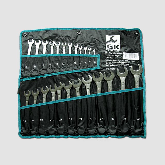 Sada očkoplochých klíčů je uložena v obalu.Klíče jsou z jedné strany ploché otevřené, ze strany druhé je dvanáctihranné očko.