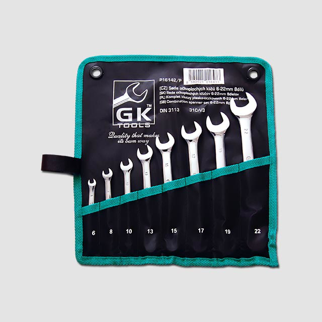 Sada očkoplochých klíčů je uložena v textilním obalu. Klíče jsou z jedné strany ploché otevřené, ze strany druhé je dvanáctihranné očko.Norma -DIN 3113 Materiál- 31CrV4