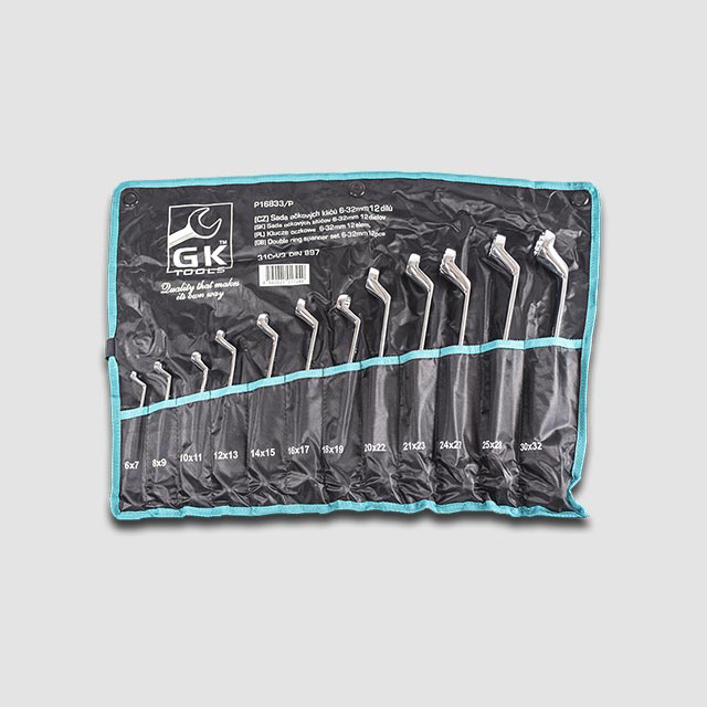 Sada vyhnutých očkových klíčů k povolování zapuštěných matic a šroubů. Textilní obal pro uložení. Norma -DIN 897 Materiál- 31CrV4