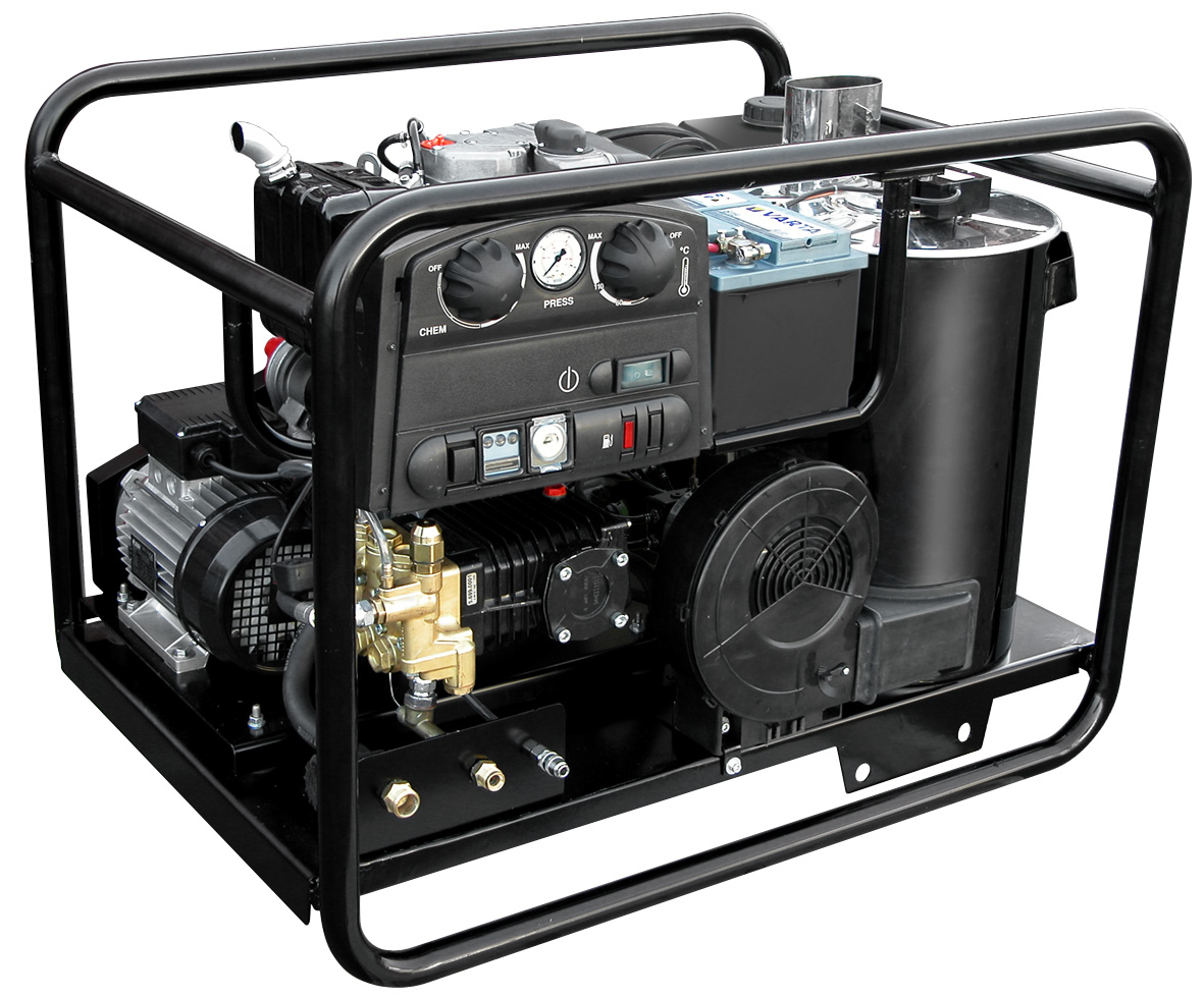 Profi vysokotlaková umývačka s ohrevom vody s dieslovým motorom Lombardini, výkon 1020 l / hod, max. Tlak 170 bar, nastaviteľný ohrev na max. 140 °C.